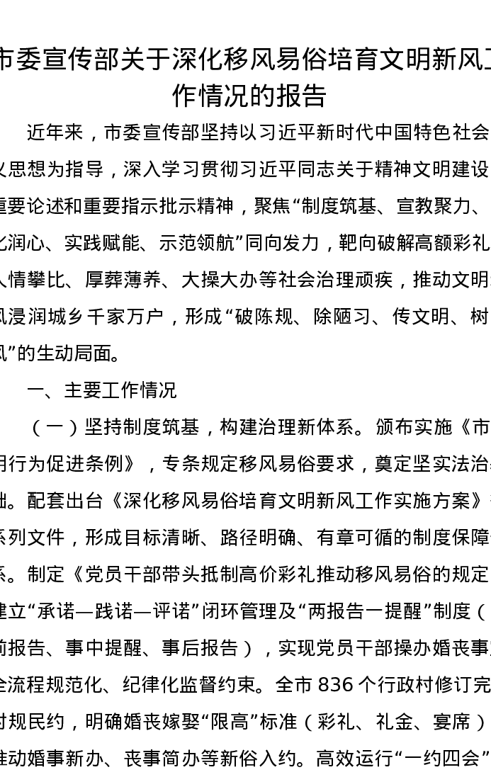 市委宣传部关于深化移风易俗培育文明新风工作情况的报告