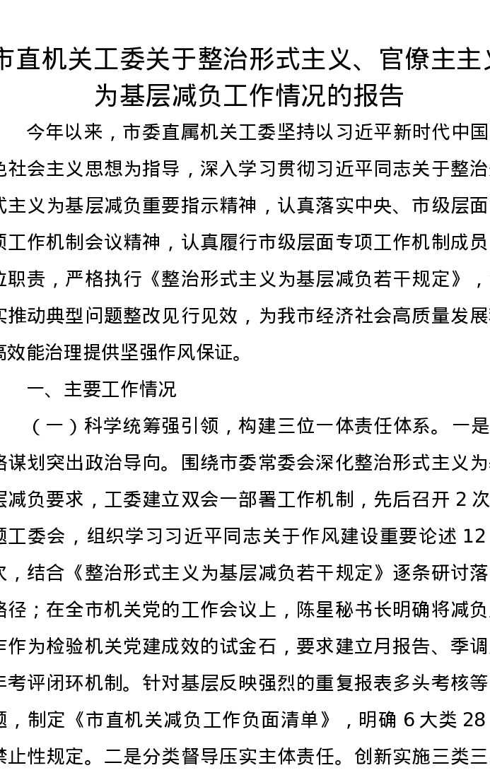 市直机关工委关于整治形式主义、官僚主主义为基层减负工作情况的报告