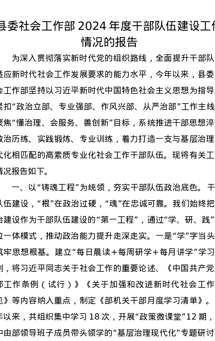 县委社会工作部2024年度干部队伍建设工作情况的报告