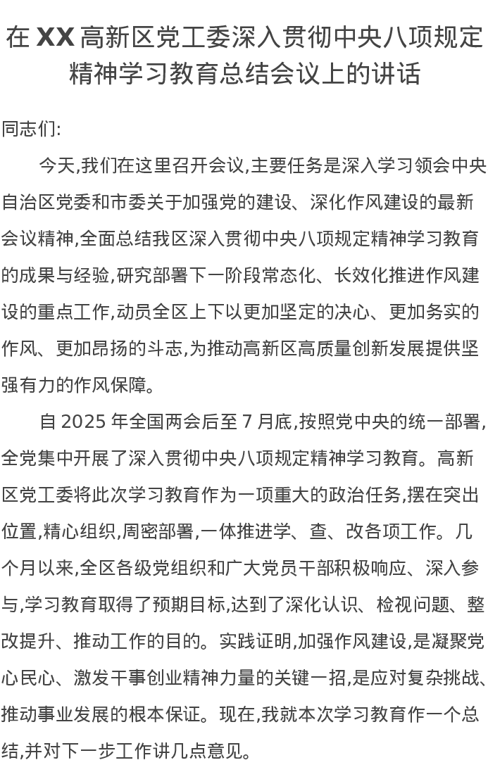 在XX高新区党工委深入贯彻中央八项规定精神学习教育总结会议上的讲话