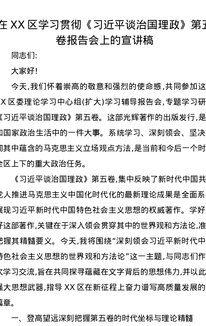 在XX区学习贯彻《习近平谈治国理政》第五卷报告会上的宣讲稿