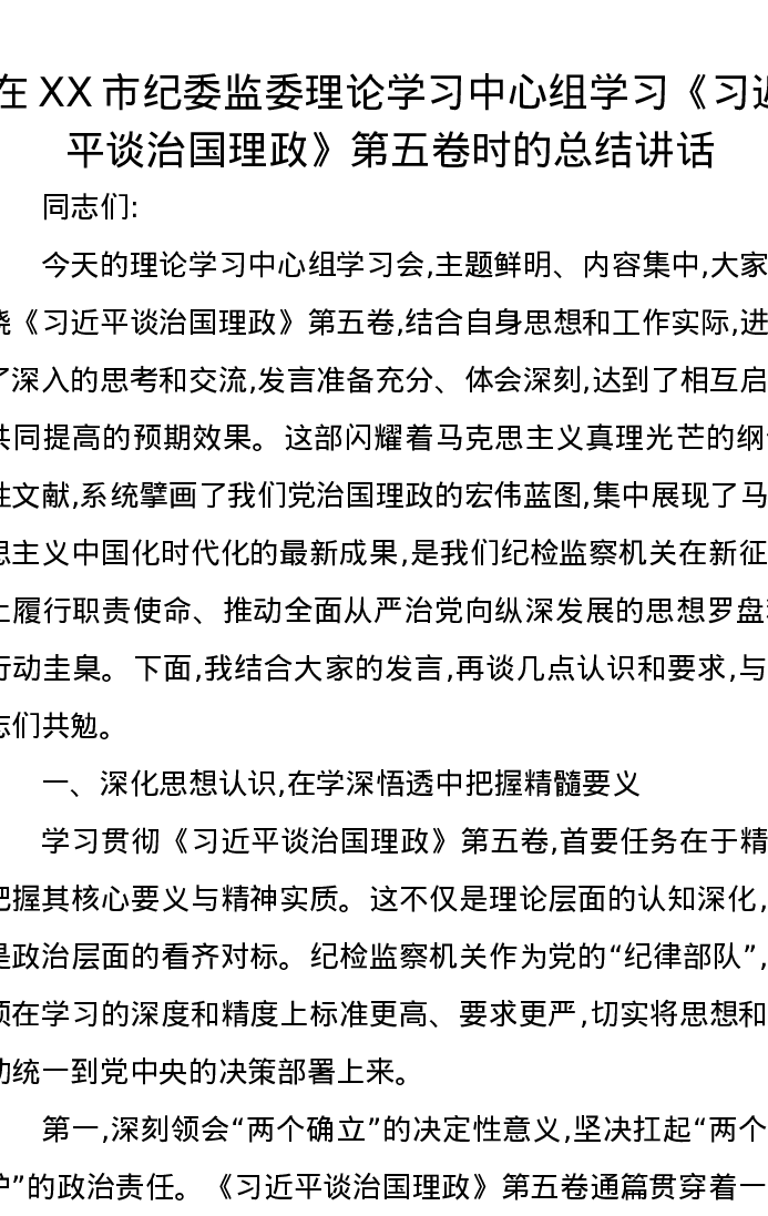 在XX市纪委监委理论学习中心组学习《习近平谈治国理政》第五卷时的总结讲话