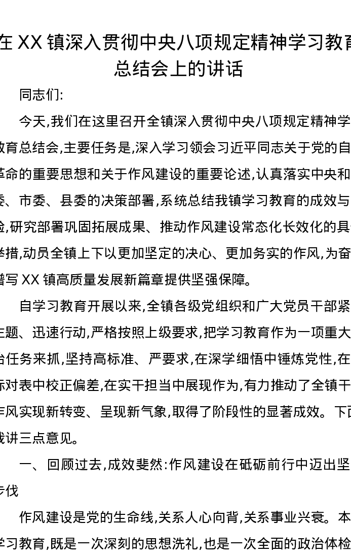 在XX镇深入贯彻中央八项规定精神学习教育总结会上的讲话