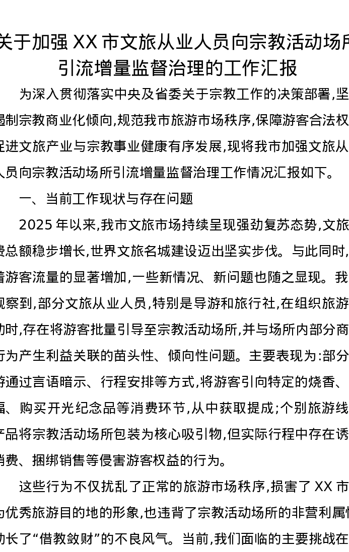 关于加强XX市文旅从业人员向宗教活动场所引流增量监督治理的工作汇报