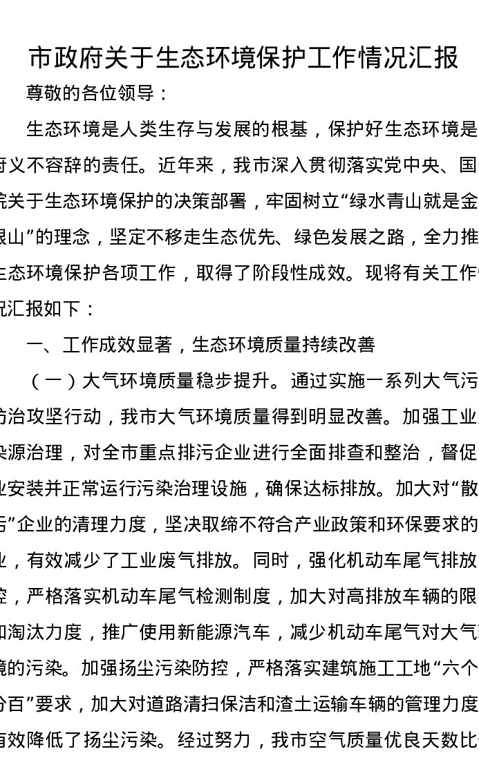 市政府关于生态环境保护工作情况汇报
