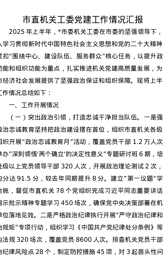 市直机关工委党建工作情况汇报