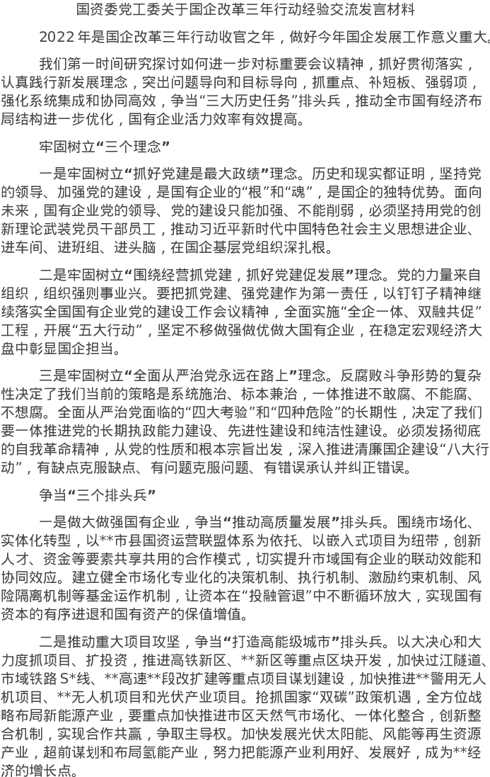 20220609国资委党工委关于国企改革三年行动经验交流发言材料