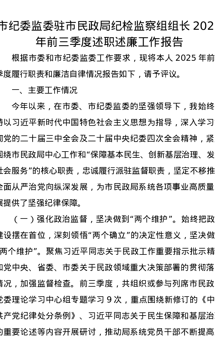 市纪委监委驻市民政局纪检监察组组长2025年前三季度述职述廉工作报告