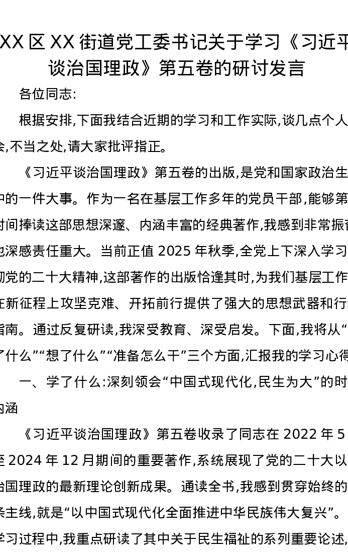 XX区XX街道党工委书记关于学习《习近平谈治国理政》第五卷的研讨发言