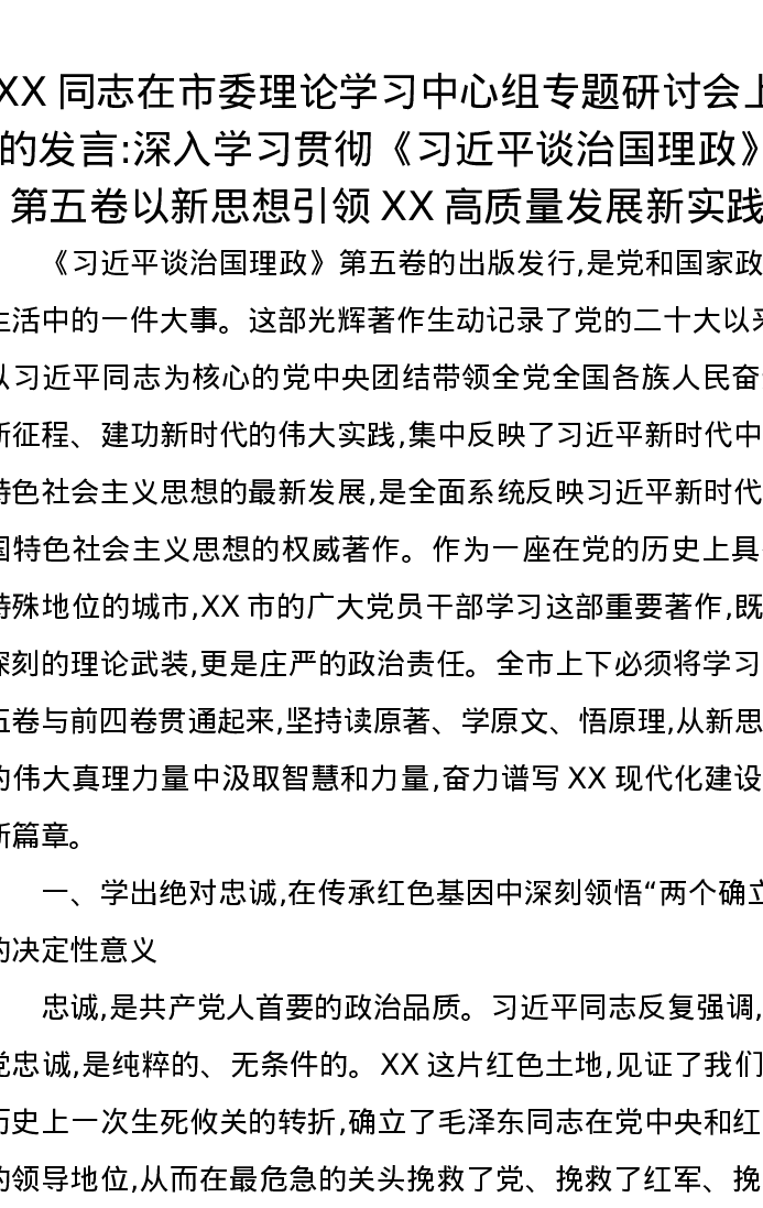 XX同志在市委理论学习中心组专题研讨会上的发言深入学习贯彻《习近平谈治国理政》第五卷以新思想引领XX高质量发展新实践