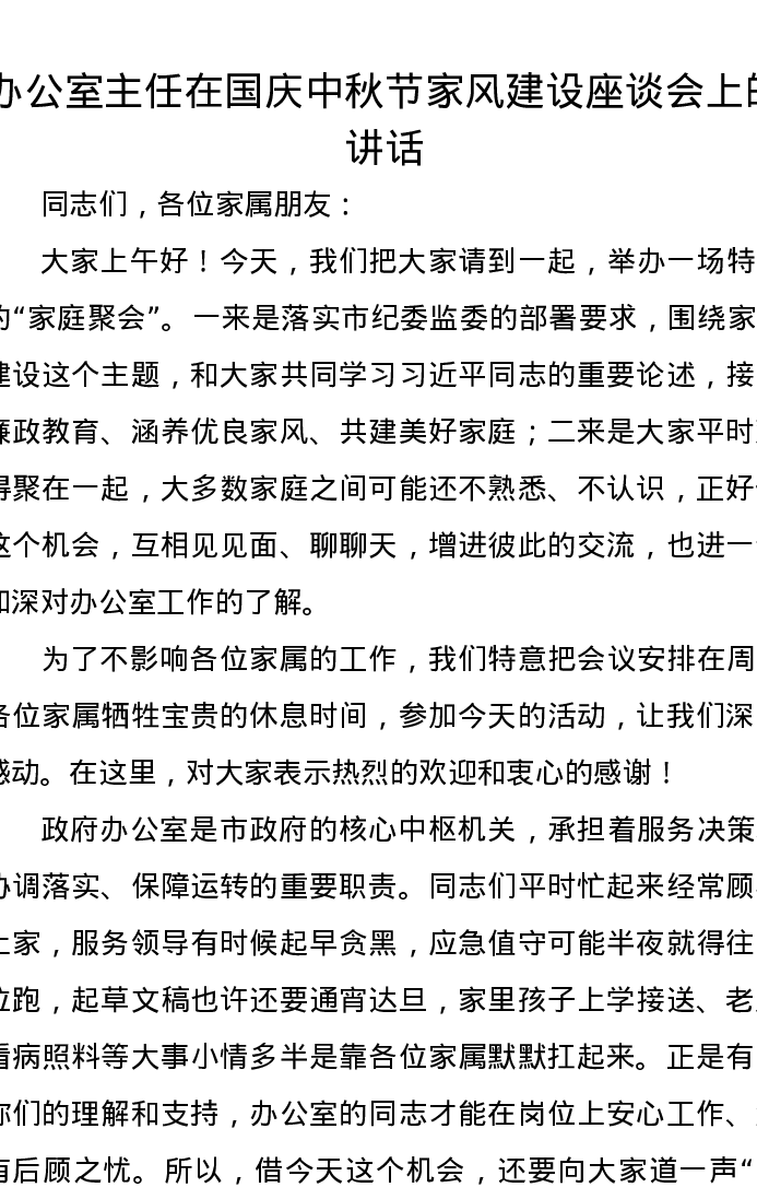 办公室主任在国庆中秋节家风建设座谈会上的讲话