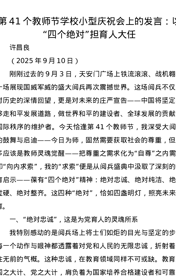 第41个教师节学校小型庆祝会上的发言:以“四个绝对”担育人大任