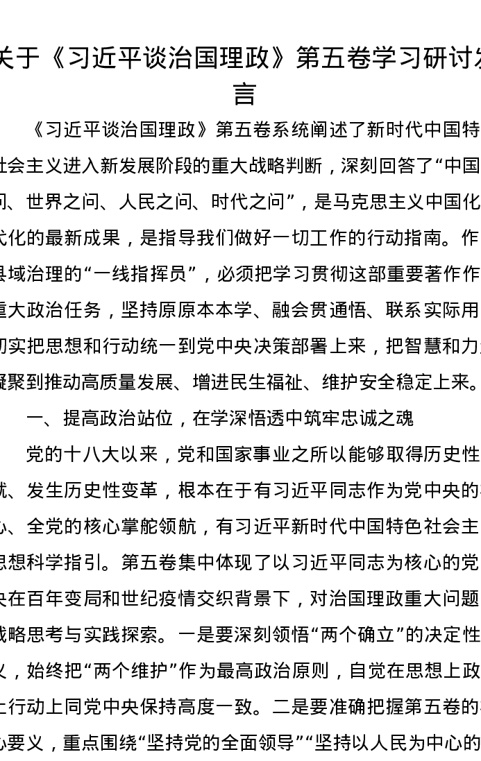 关于《习近平谈治国理政》第五卷学习研讨发言