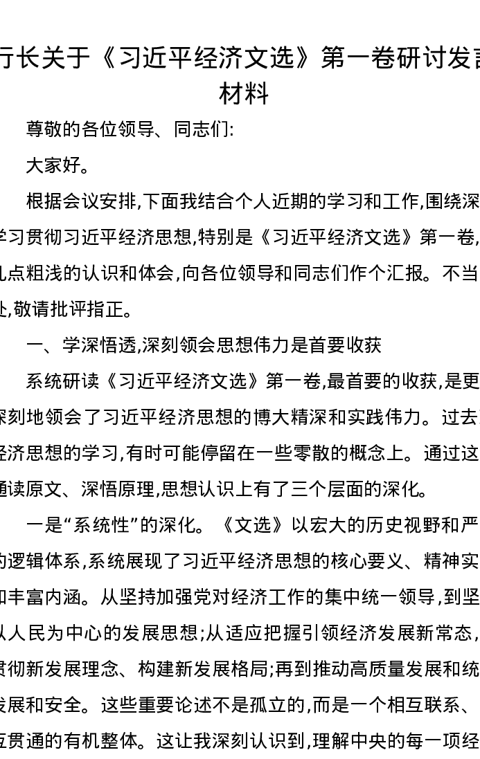 行长关于《习近平经济文选》第一卷研讨发言材料