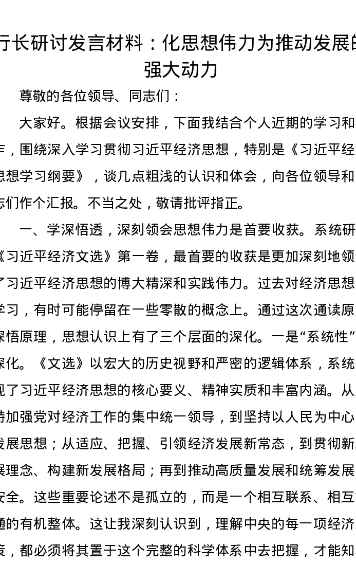 行长研讨发言材料:化思想伟力为推动发展的强大动力