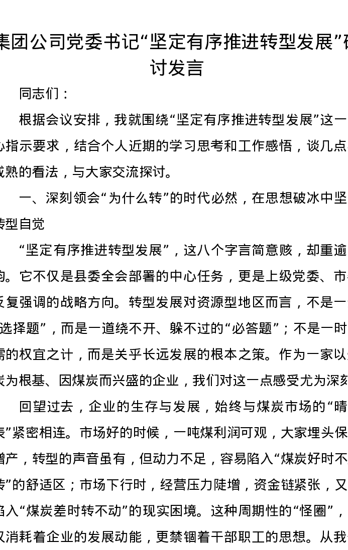 集团公司党委书记“坚定有序推进转型发展”研讨发言