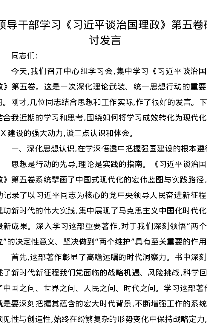 领导干部学习《习近平谈治国理政》第五卷研讨发言
