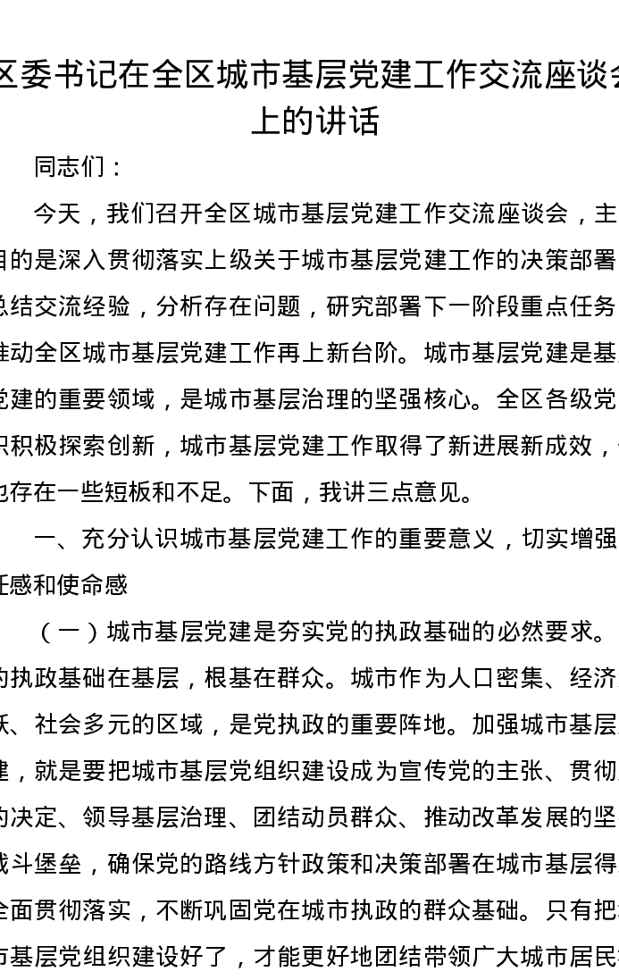 区委书记在全区城市基层党建工作交流座谈会上的讲话