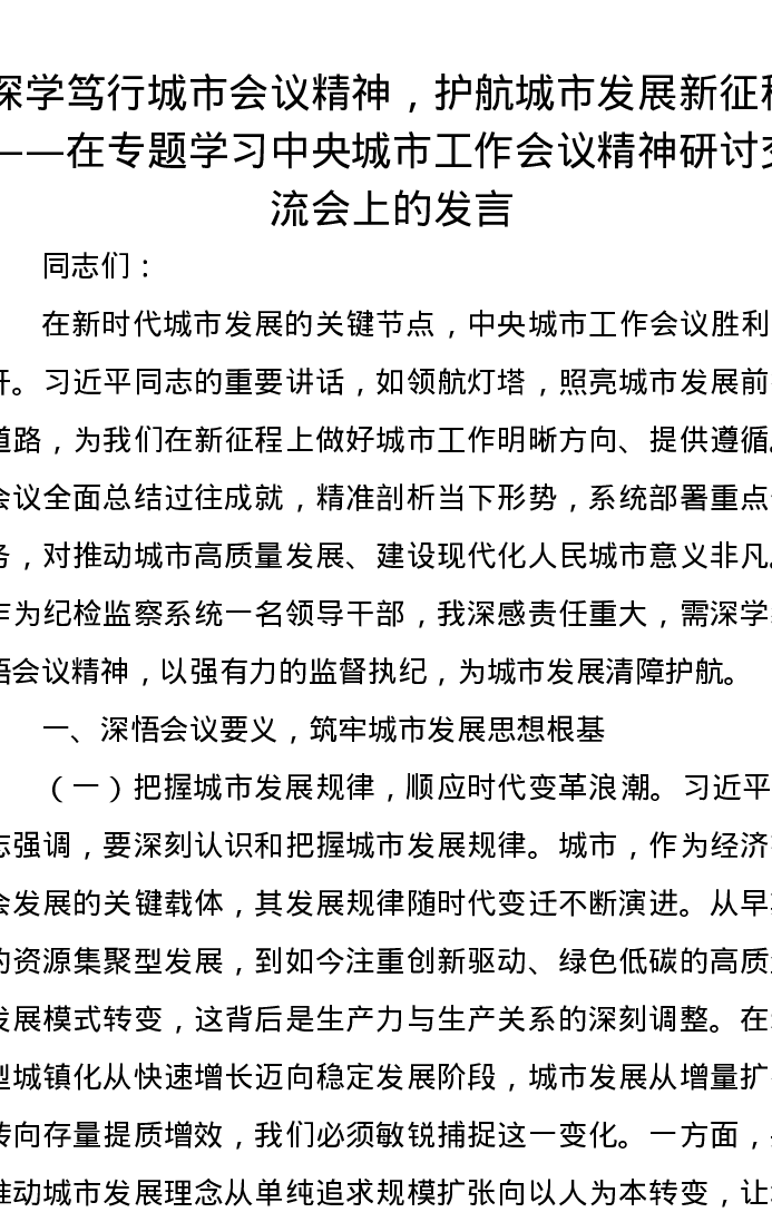 深学笃行城市会议精神,护航城市发展新征程——在专题学习中央城市工作会议精神研讨交流会上的发言