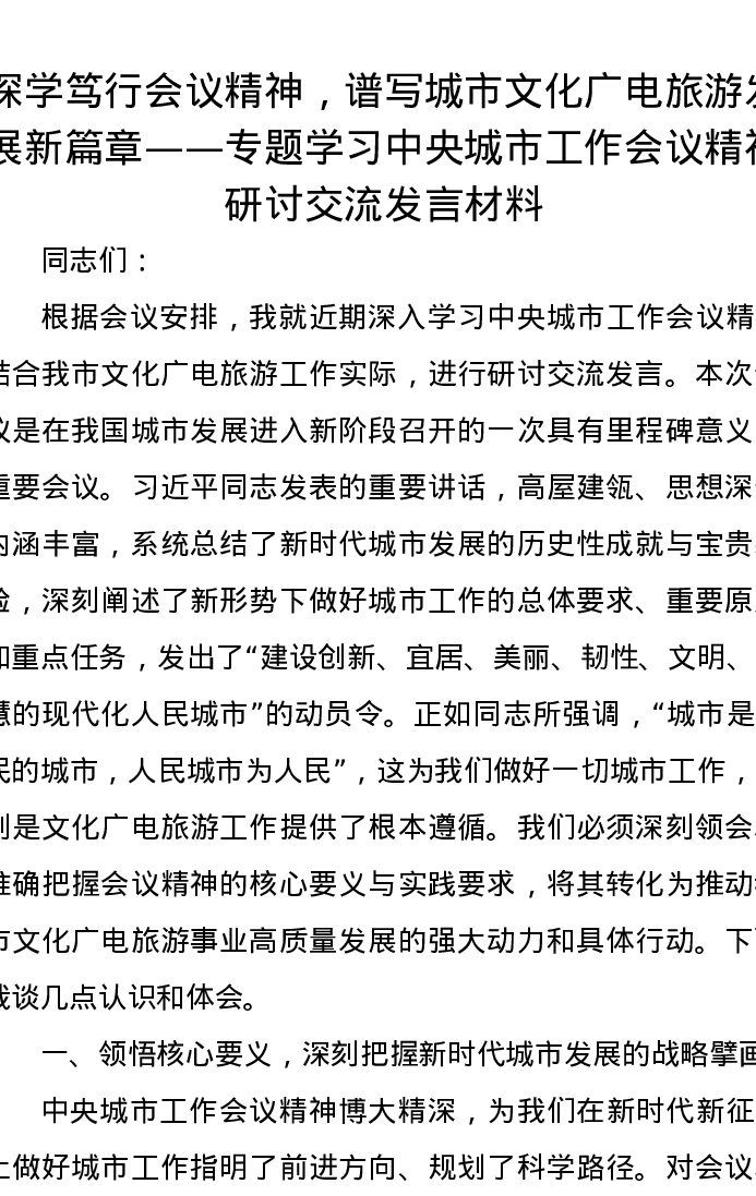 深学笃行会议精神,谱写城市文化广电旅游发展新篇章——专题学习中央城市工作会议精神研讨交流发言材料