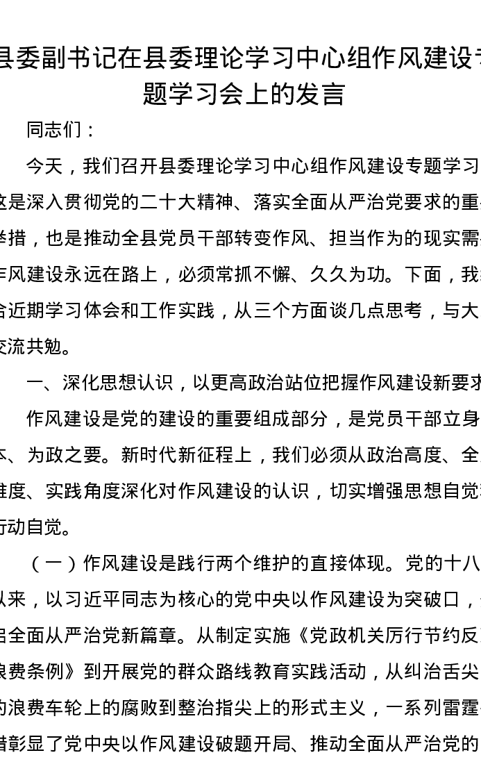 县委副书记在县委理论学习中心组作风建设专题学习会上的发言