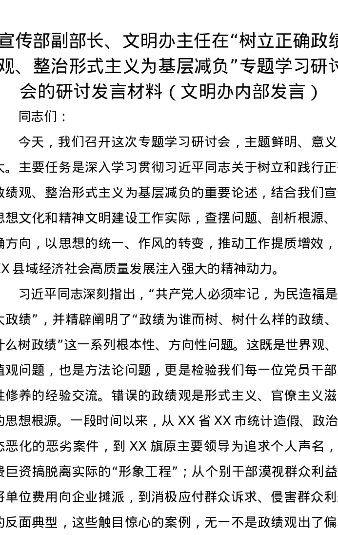 宣传部副部长、文明办主任在“树立正确政绩观、整治形式主义为基层减负”专题学习研讨会的研讨发言材料(文明办内部发言)