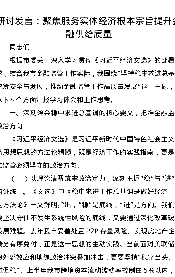 研讨发言:聚焦服务实体经济根本宗旨 提升金融供给质量