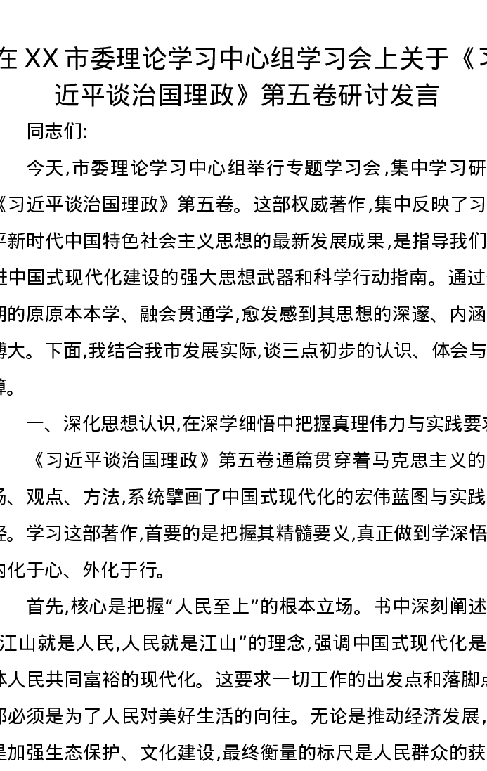 在XX市委理论学习中心组学习会上关于《习近平谈治国理政》第五卷研讨发言