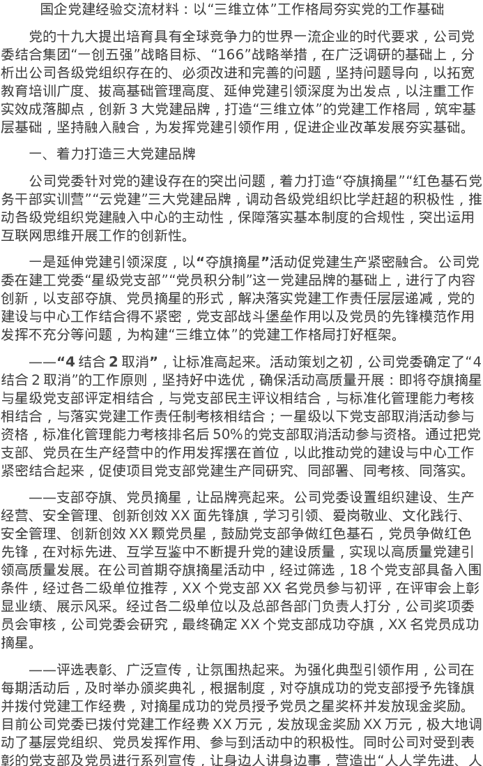 20220615国企党建经验交流材料:以“三维立体”工作格局夯实党的工作基础