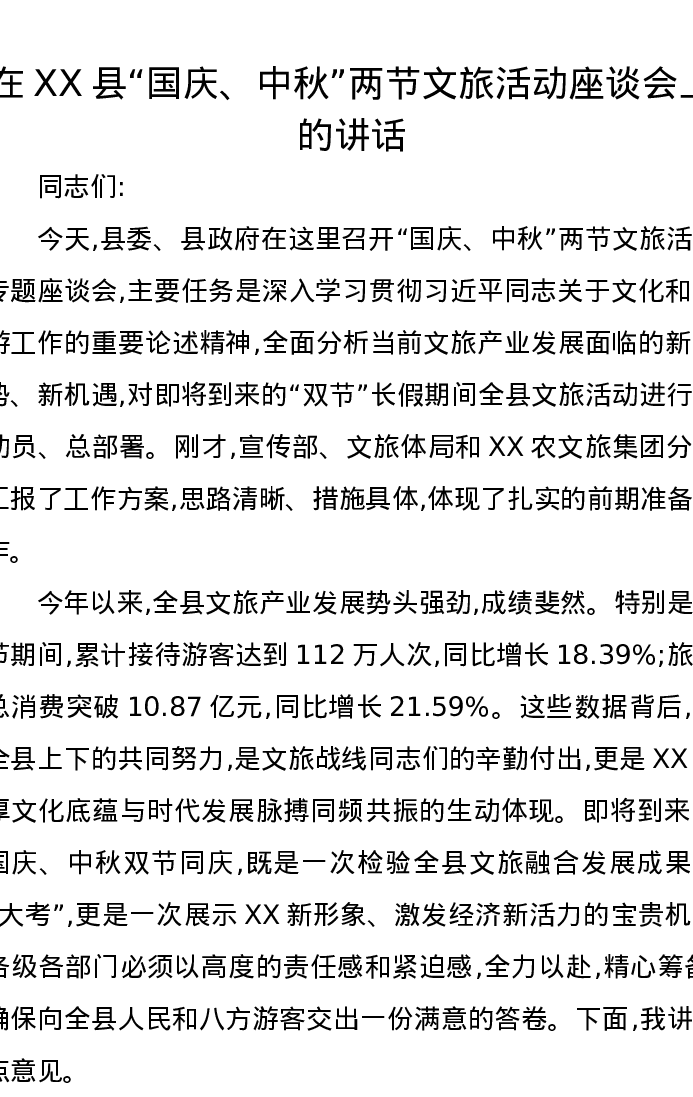 在XX县“国庆、中秋”两节文旅活动座谈会上的讲话