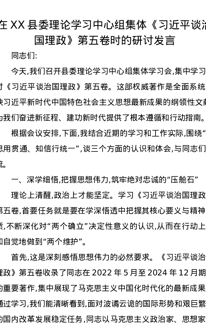 在XX县委理论学习中心组集体《习近平谈治国理政》第五卷时的研讨发言