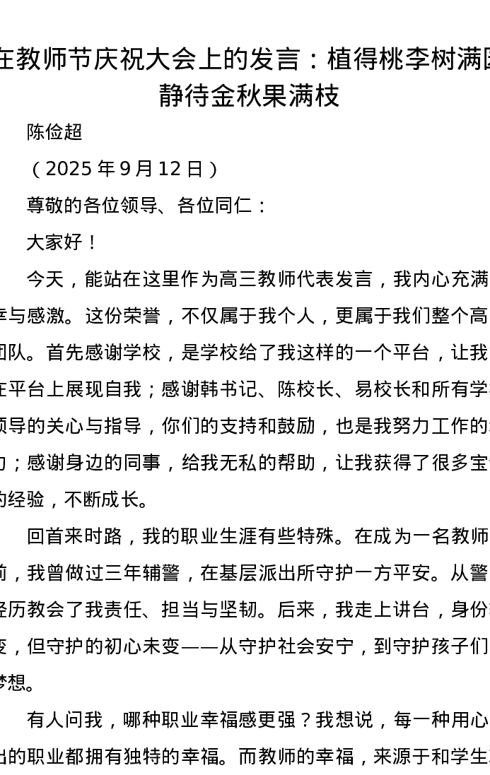 在教师节庆祝大会上的发言:植得桃李树满园,静待金秋果满枝
