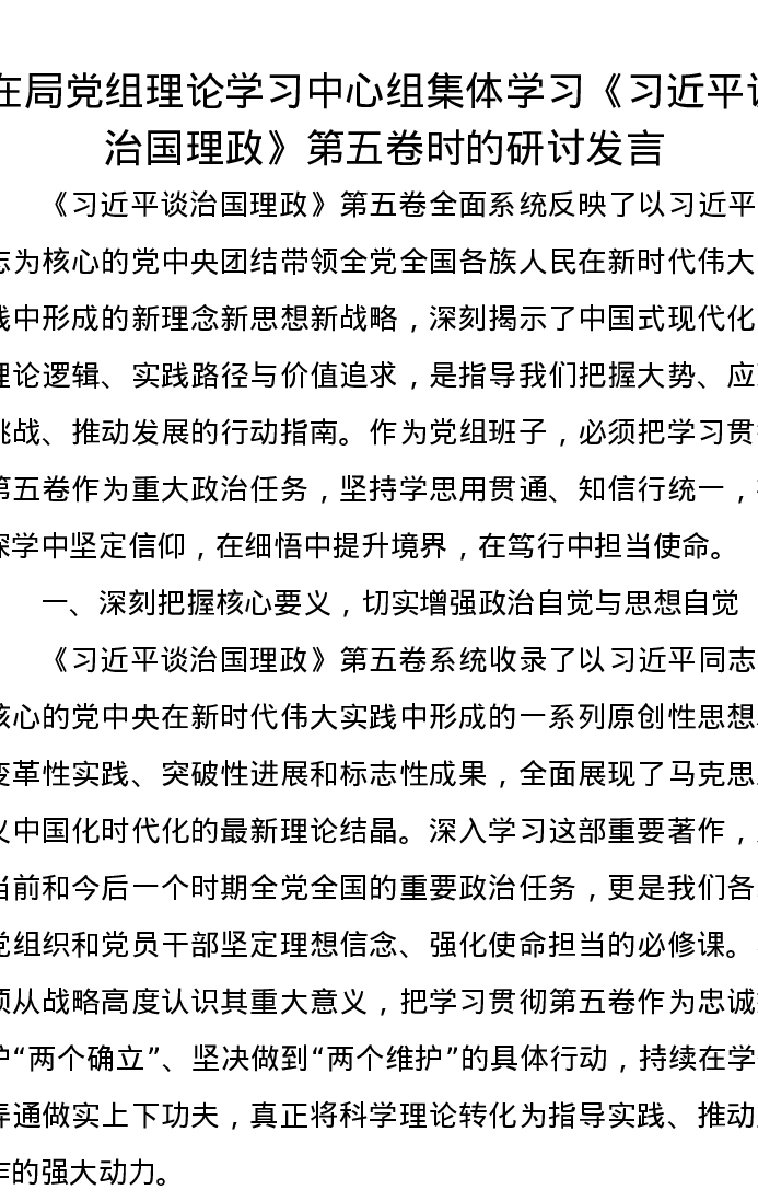 在局党组理论学习中心组集体学习《习近平谈治国理政》第五卷时的研讨发言