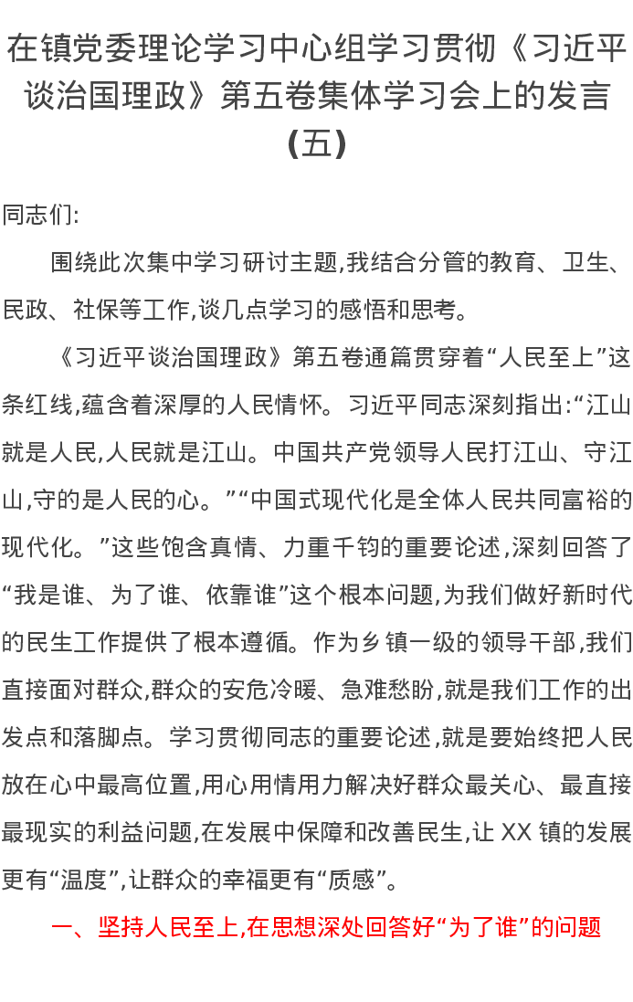 在镇党委理论学习中心组学习贯彻《习近平谈治国理政》第五卷集体学习会上的发言(五)