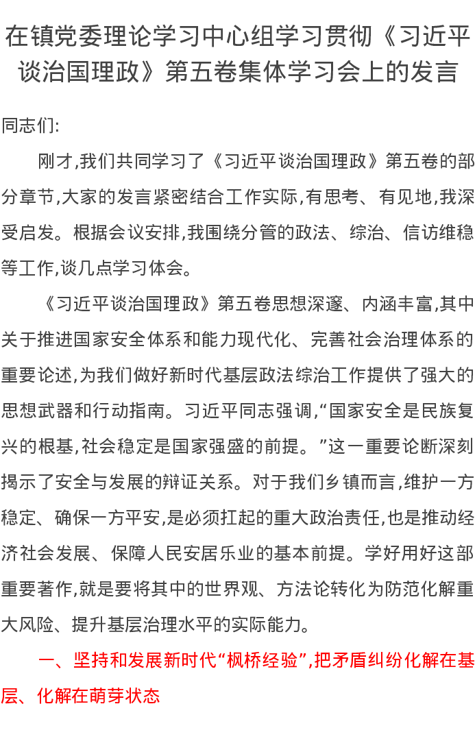在镇党委理论学习中心组学习贯彻《习近平谈治国理政》第五卷集体学习会上的发言(一)
