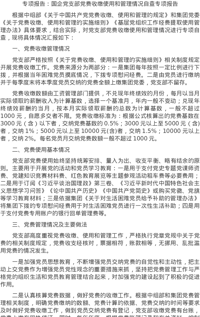 20220625专项报告:国企党支部党费收缴使用和管理情况自查专项报告