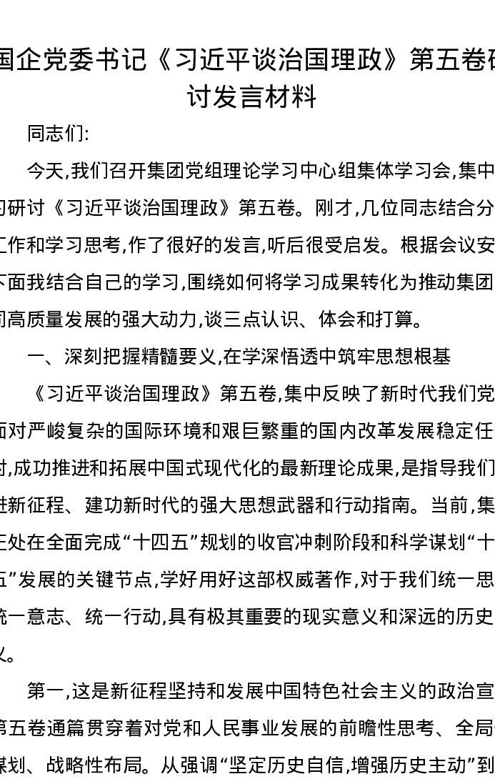 国企党委书记《习近平谈治国理政》第五卷研讨发言材料