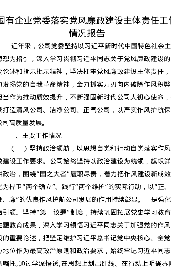 国有企业党委落实党风廉政建设主体责任工作情况报告