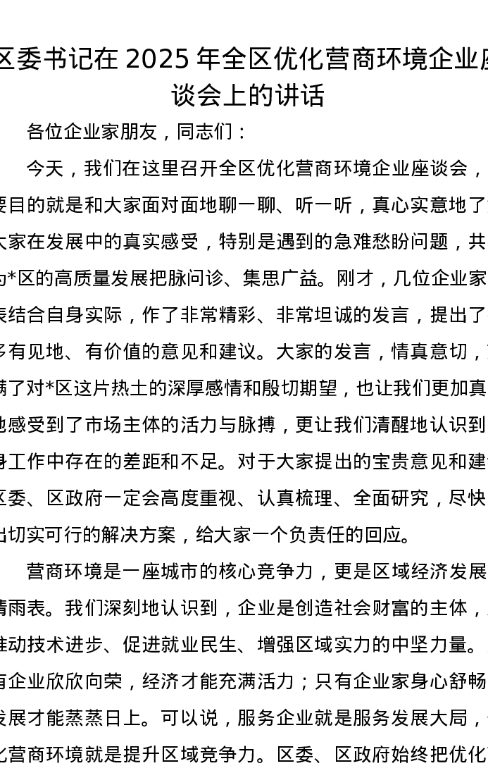 区委书记在2025年全区优化营商环境企业座谈会上的讲话