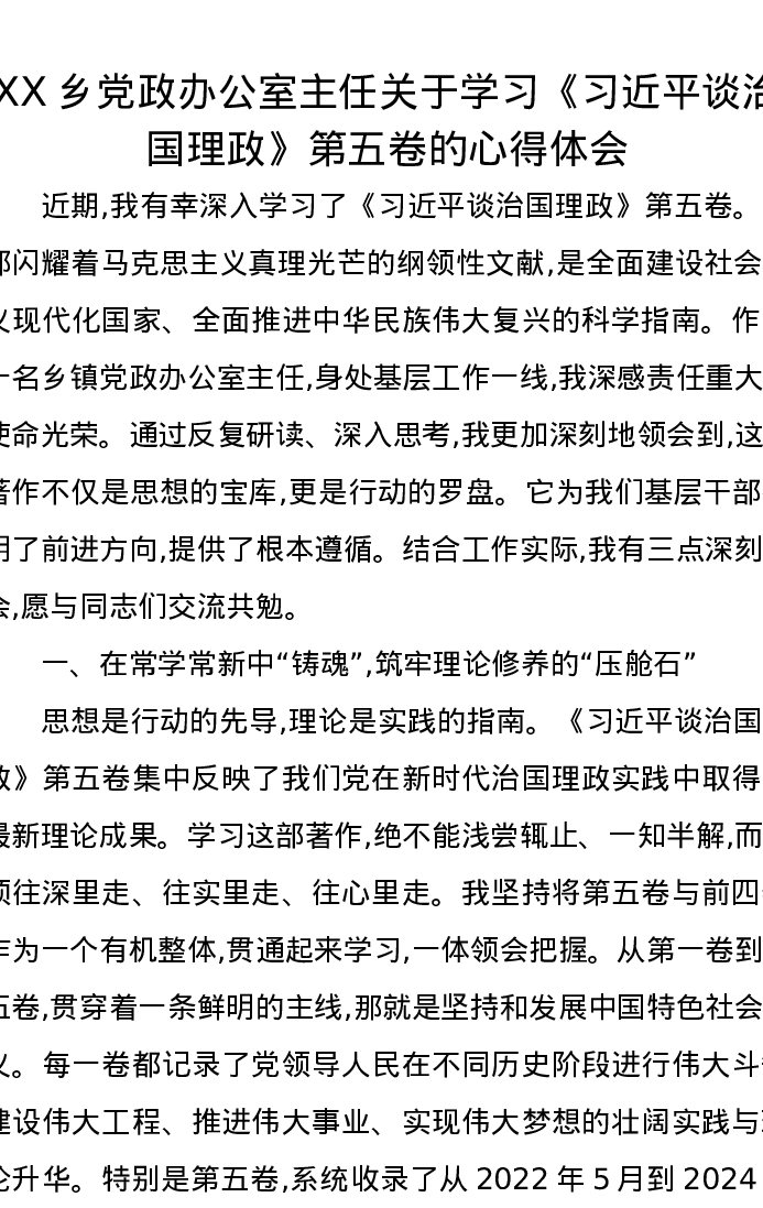 XX乡党政办公室主任关于学习《习近平谈治国理政》第五卷的心得体会