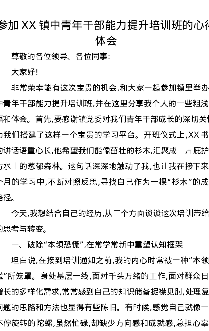 参加XX镇中青年干部能力提升培训班的心得体会