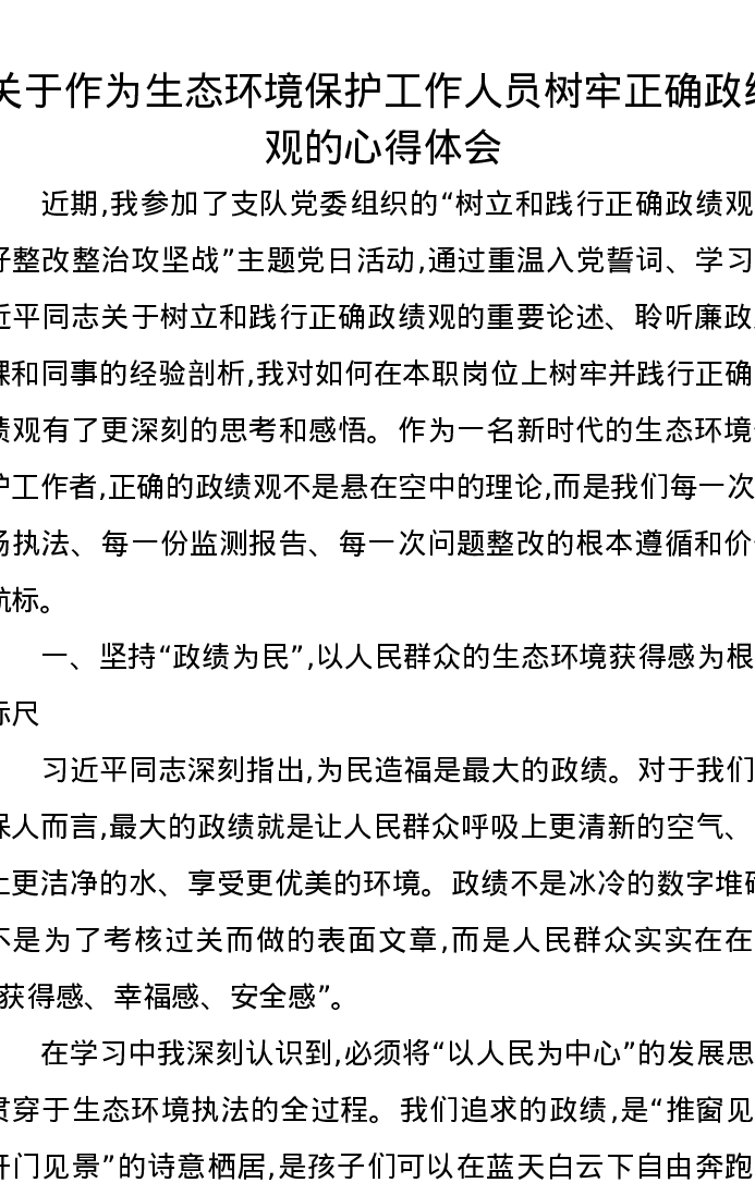 关于作为生态环境保护工作人员树牢正确政绩观的心得体会