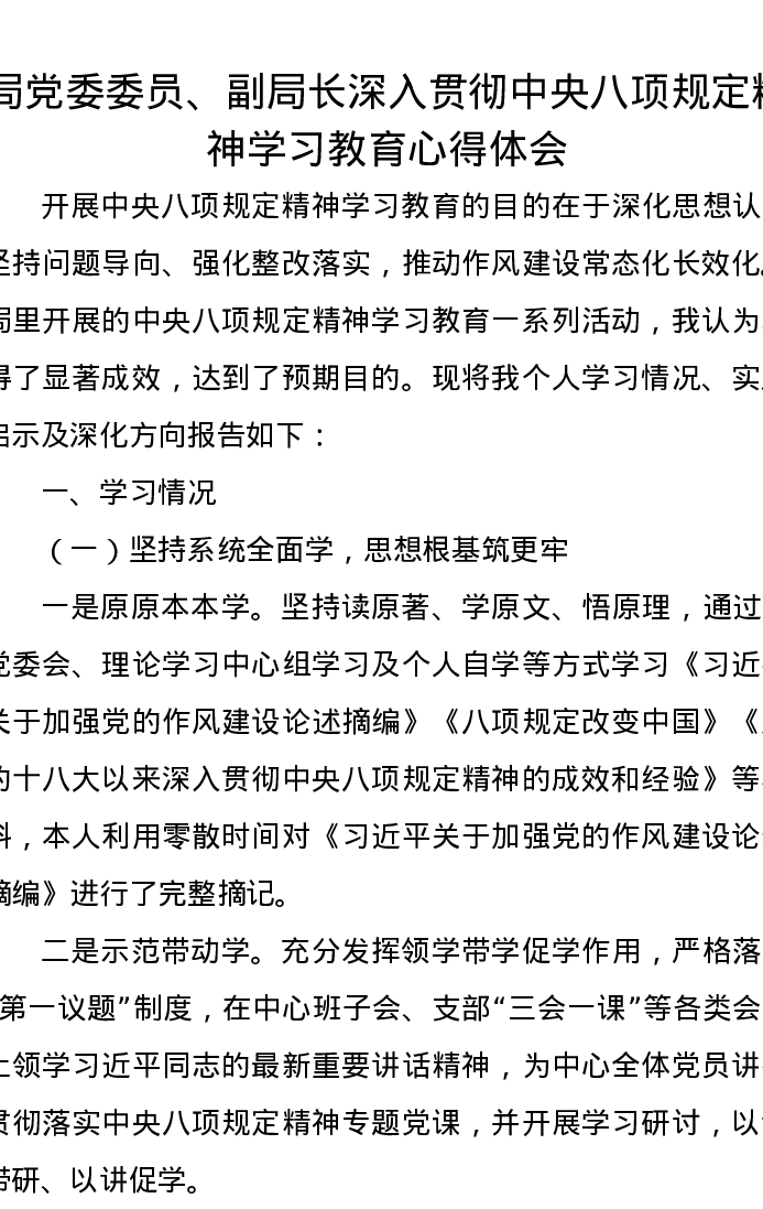 局党委委员、副局长深入贯彻中央八项规定精神学习教育心得体会