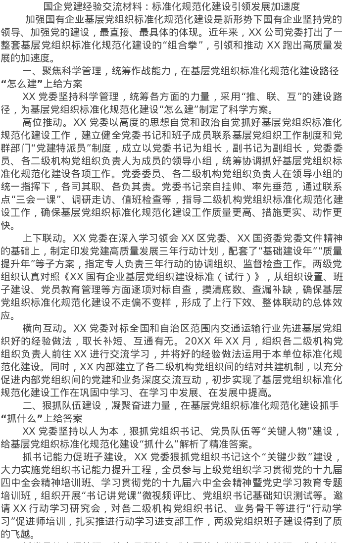 20220629国企党建经验交流材料:标准化规范化建设引领发展加速度