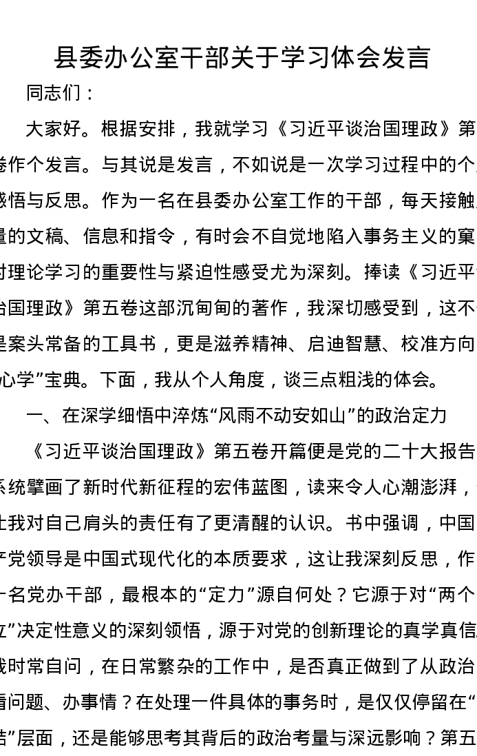 县委办公室干部关于学习体会发言