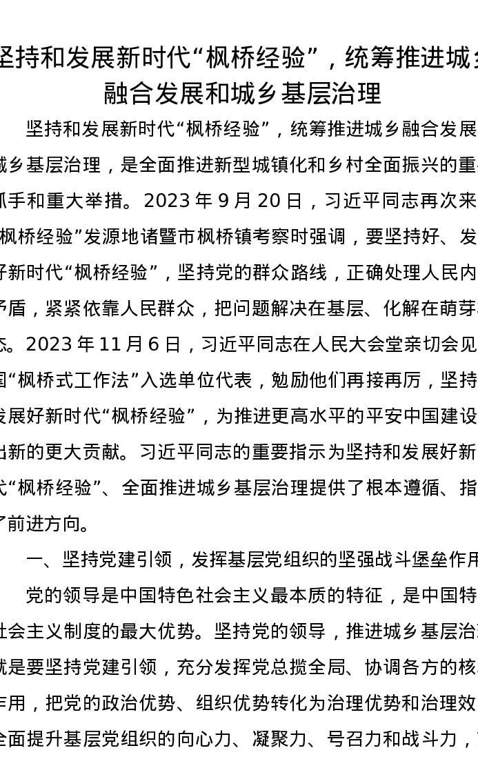 党课讲稿:坚持和发展新时代“枫桥经验”,统筹推进城乡融合发展和城乡基层治理