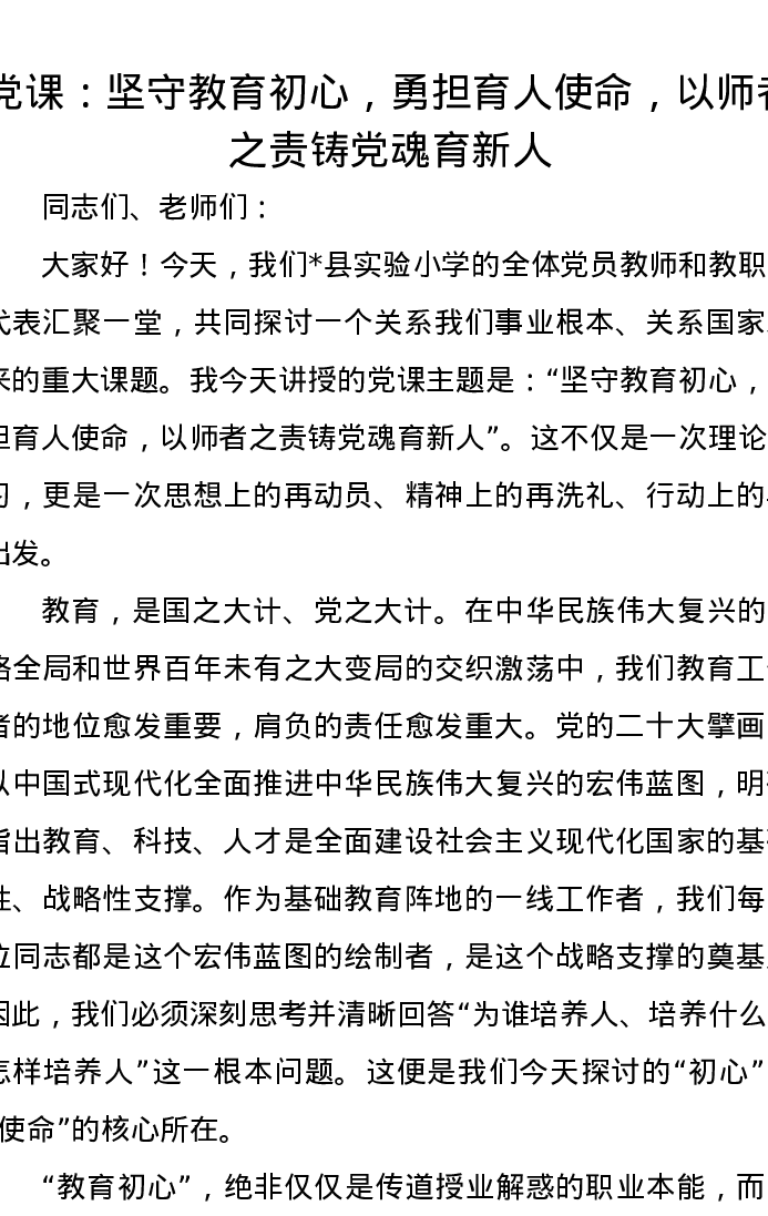 党课讲稿:坚守教育初心,勇担育人使命,以师者之责铸党魂育新人