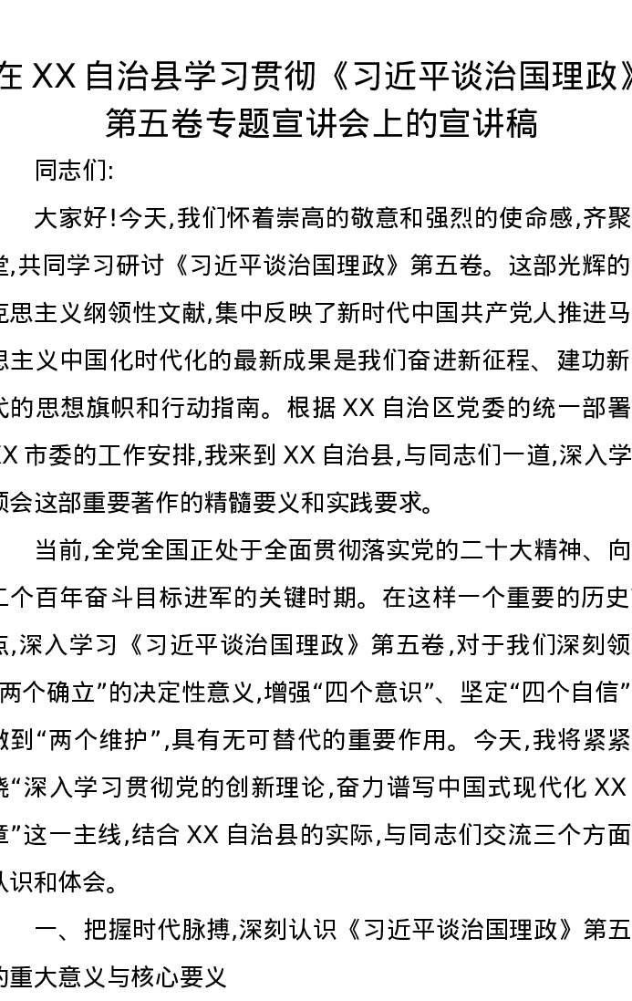 在XX自治县学习贯彻《习近平谈治国理政》第五卷专题宣讲会上的宣讲稿