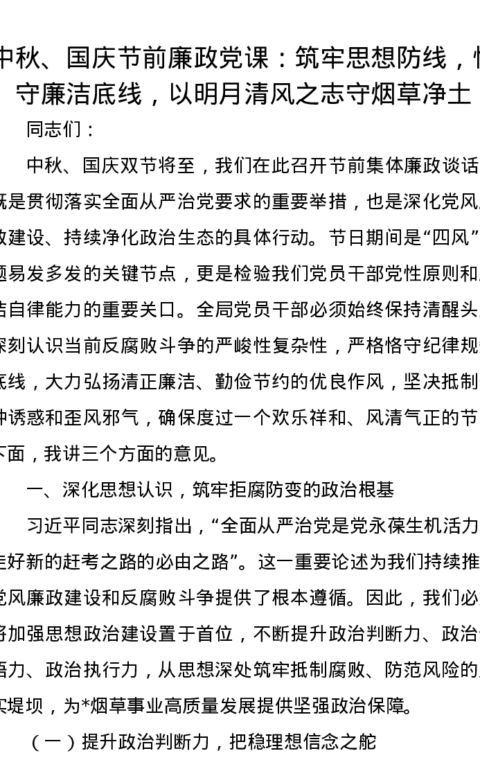 中秋、国庆节前廉政党课讲稿:筑牢思想防线,恪守廉洁底线,以明月清风之志守烟草净土