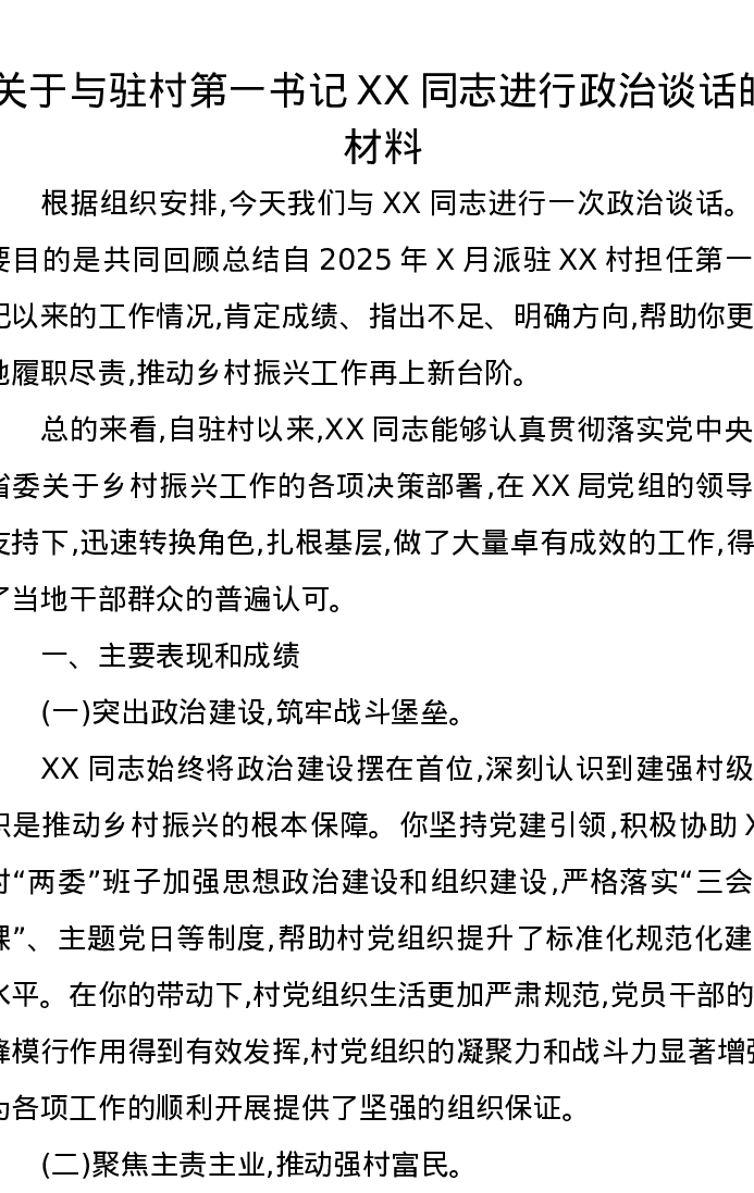 关于与驻村第一书记XX同志进行政治谈话的材料